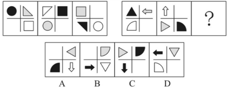 【答案】B?!窘馕觥?/span>第一步,觀察特征。圖形組成和填充顏色相同,優(yōu)先考慮動態(tài)位置。第二步,兩段式,第一段找規(guī)律,第二段應用規(guī)律。第一段中,三幅圖中都有正方形、三角形、圓圈三種元素,且都有黑、白、灰三種不同顏色。從元素看,每種小元素沿逆時針方向平移一步,同時圖形自己逆時針方向旋轉90°,從顏色看,每種元素都出現了三種填充顏色;將此規(guī)律應用到第二段,只有B項符合。故正確答案為B。