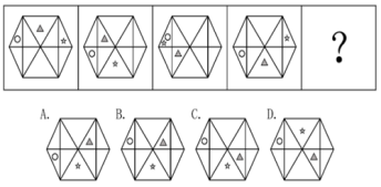 【答案】C。【解析】第一步,觀察特征。組成元素相同,元素位置發(fā)生變化,優(yōu)先考慮動態(tài)位置類平移。第二步,一條式,從左到右找規(guī)律。觀察輪廓內三種元素的位置,發(fā)現三角形沿著矩形內部的六個面每次逆時針平移一個位置,圓圈在左側的兩個區(qū)域內循環(huán)移動,五角星在和外邊框相連的六個面上每次順時針移動2個位置,觀察選項,只有C項符合。故正確答案為C。
