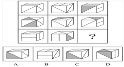【答案】B。【解析】解法一:元素組成不同,無明顯屬性規(guī)律,考慮數量規(guī)律。觀察發(fā)現,圖形分割明顯,考慮面數量。九宮格優(yōu)先橫向觀察,橫行數面無規(guī)律,考慮豎向觀察。繼續(xù)觀察發(fā)現,第一列的白面數量相加為16;代入第二列驗證,第二列與第一列規(guī)律相同。因此,第三列也應滿足此規(guī)律,前兩幅圖的白面數量之和為10,故問號處應選擇一個白面數量為6的圖形,只有B項符合。解法二:元素組成不同,無明顯屬性規(guī)律,考慮數量規(guī)律。觀察發(fā)現,圖形分割明顯,考慮面數量。九宮格優(yōu)先橫向觀察,橫行數面無規(guī)律,考慮豎向觀察。繼續(xù)觀察發(fā)現,第一列的灰面數量相加為2;代入第二列驗證,第二列與第一列規(guī)律相同。因此,第三列也應滿足此規(guī)律,前兩幅圖的灰面數量之和為2,故問號處應選擇一個灰面數量為0的圖形,只有B項符合。故正確答案為B。