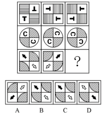 【答案】A?!窘馕觥?/span>元素組成不同,優(yōu)先考慮屬性規(guī)律。九宮格優(yōu)先看橫行,第一行圖形均由直線構成,第二行圖形均由曲線構成,第三行圖形均由直線和曲線構成,因此問號處圖形應由直線和曲線構成,只有A項符合,當選。故正確答案為A。