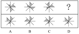 【答案】B。【解析】第一步,觀察特征。組成元素相同,優(yōu)先考慮位置類規(guī)律。第二步,一條式,從左到右找規(guī)律。圖中一共是三個大小不一樣的陰影三角形,它們整體沿直線向逆時針方向翻轉。只有B項符合。故正確答案為B。