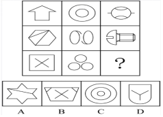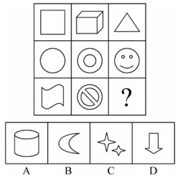 【答案】D。【解析】第一步,觀察特征。組成元素不同,優(yōu)先考慮數量類或屬性類。每個圖形均有封閉區(qū)間,考慮數面。第二步,九宮格,橫向規(guī)律較為常見,優(yōu)先考慮。題干中九宮格中,第一列全部為直線圖形,第二列全部為曲線圖形,第三列有曲有直。分析選項。A項:直線圖形,排除;B項:直線圖形,排除;C項:曲線圖形,排除;D項:有曲有直,符合。故正確答案為D。