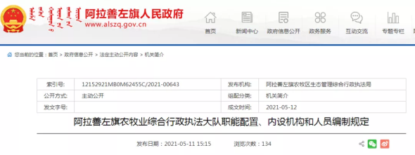 第二條:阿拉善左旗農(nóng)牧區(qū)生態(tài)管理綜合行政執(zhí)法局更名為阿拉善左旗農(nóng)牧業(yè)綜合行政執(zhí)法大隊。為旗人民政府直屬事業(yè)單位,機構(gòu)規(guī)格相當(dāng)于正科級。