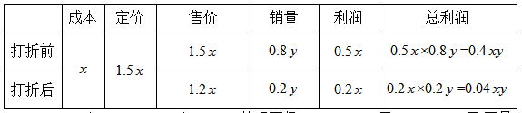 【答案】C【解析】通過題目可知這批童裝在銷售時分為打折前和打折后兩個階段,所以不妨在表格中將這兩個階段表示出來,接著題目說“按每套獲利50%定價賣出這批童裝的80%”,此時給出打折前的利潤率為50%,需注意:利潤率=售價/成本-1;此時如果設成本為y,則剛開始的定價應為1.5x;同時已知打折前賣出80%,其實也就是總銷量的80%,但總銷量未知,所以如果設總銷量為x,則打折前售出0.8y,之后“定價的八折將剩下的童裝全部賣出”,即打折后的售價應為:1.5x×0.8=1.2x,同時打折后的銷量為1-0.8y=0.2y,最后題目給出等量關系“總利潤比預期減少了390元”,其實就是:按原定價銷售完的總利潤-(打折前的總利潤+打折后的利潤)=390元。之前已表示出兩個階段的成本、售價、銷量;所以兩個階段分別的總利潤=單套利潤×銷量;而單套利潤=售價-成本,把出現(xiàn)的基本概念全部表示在表格中,再根據(jù)等量關系就有: