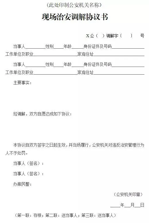 現(xiàn)場調(diào)解達(dá)成協(xié)議的,應(yīng)當(dāng)制作《現(xiàn)場治安調(diào)解協(xié)議書》一式三聯(lián)(式樣附后),由雙方當(dāng)事人簽名。