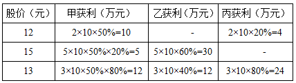 【例題1】甲、乙、丙三人各出100萬元資金購買某種每股10元的股票,當(dāng)股價漲到12元時甲賣出50%,丙賣出20%;當(dāng)股價漲到15元時甲賣出剩余部分的20%,乙賣出60%;此后股價回落到13元時三人全部賣出剩余股票。如不計稅費,則此次投資獲利最高的人比獲利最低的人多賺多少萬元?( )
