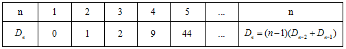 上述題目當中相當于要把3個元素(信)的位置(信封)重新排列,使得每個元素都不在原來的位置上,這類題目我們稱之為“錯位重排”。當元素較少時我們可以通過枚舉法將所有結果羅列出來。但是當元素過多時,情況比較復雜,再用枚舉法顯然不合適,所以需要我們熟記錯位重排的常用數(shù)據(jù)以及遞推公式。