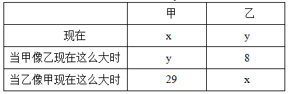 例3:甲乙兩人年齡不等,已知當甲像乙現(xiàn)在這么大時,乙8歲;當乙像甲現(xiàn)在這么大時,甲29歲。問今年甲的年齡為多少歲( )?