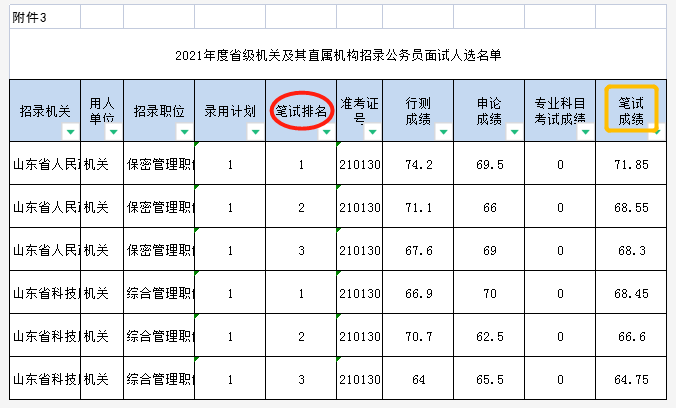 最后,看面試公告,查完成績(jī)當(dāng)天各地會(huì)陸續(xù)發(fā)布面試公告,公告附件中會(huì)有面試名單,名單中就有你的筆試成績(jī)及筆試排名,如下: