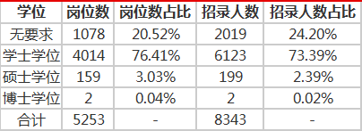 3、學(xué)位:大部分崗位對(duì)于學(xué)位有要求,無(wú)學(xué)位要求的崗位占比僅20.52%;