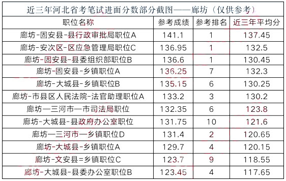2020 年河北公務(wù)員考試?yán)确坏貐^(qū)招錄144個(gè)崗位,招錄人數(shù)285人,最低進(jìn)面分?jǐn)?shù)線104.15,最高進(jìn)面分?jǐn)?shù)147.25,平均進(jìn)面分?jǐn)?shù)線為 113.77。由平均分來看,廊坊市政府部門 130、各鄉(xiāng)鎮(zhèn)集中在 127、法檢系統(tǒng)集中在 125。