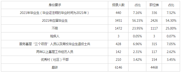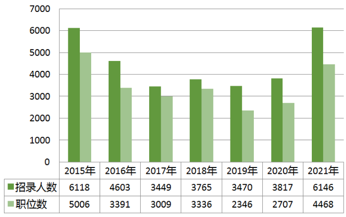 從以上報(bào)考人員身份要求來看,對(duì)工作經(jīng)歷要求不高,且對(duì)應(yīng)屆生畢業(yè)生來說是一次很好的機(jī)會(huì),僅限2021應(yīng)屆畢業(yè)生的招錄人數(shù)高達(dá)3415人,而且近三年來,不限制工作經(jīng)歷的職位逐漸增加,這些職位應(yīng)屆生都可以報(bào)名,選擇空間更大,機(jī)會(huì)更多,這也與國(guó)家“穩(wěn)就業(yè)”的指導(dǎo)方針相一致。