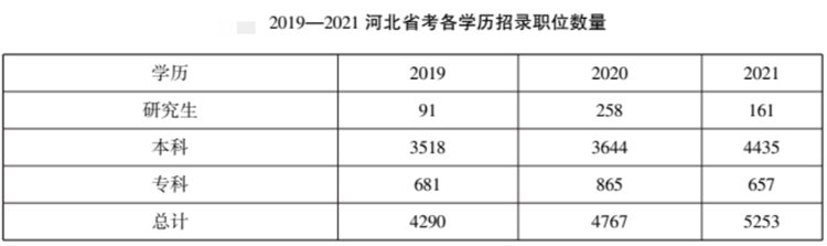 每年的學歷要求都很受大家的關注,從2021年河北省考職位表來看,本科仍然為省考報考主力軍,招錄人數(shù)占到總人數(shù)的84.43%;占比與去年上升。專科學歷的要求也與去年減少,但要求研究生學歷的招錄人數(shù)也減少,說明河北省考對于高學歷人才的需求在上升。