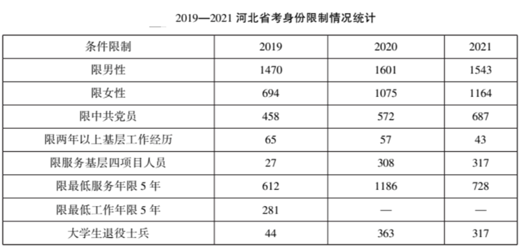 為廣開進賢之路,吸引和鼓勵更多優(yōu)秀人員報考河北公務員,不限戶籍崗位4777,限制戶籍崗位476個,這些職位為2021河北公務員考試大開綠燈,讓大家在就業(yè)選擇方面提供了更多機遇。近三年河北省考身份限制情況統(tǒng)計,如下所示。