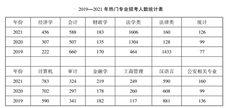 河北省考中, 法學類、計算機類、 經濟類 (含經濟學、 會計、 財務管理等)、 漢語言文學一直是招錄的熱門專業(yè), 可以選擇的職位非常多。本章簡單列舉下 2019—2021 年度熱門專業(yè)招考人數(shù)統(tǒng)計表, 供大家參考。具體可報崗位請以 2022 年的職位表為準。