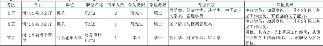 如上表所述,每年職位表都會有很多要求,每項要求都需要符合才能報考。我們需要重點關注一下:招錄人數、學歷學位、專業(yè)要求和其他要求這幾項,必須都得符合才能報考。有些同學忽視了最后一項的其他要求,那么就有可能審核不通過導致報名失敗。