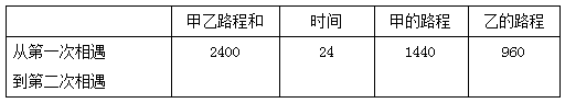 在這一過程中我們用圈2來表示甲乙第二次相遇的點,我們來觀察第二張行程圖,發(fā)現(xiàn)此時甲乙兩人走過的路程和變成了兩段的AB段路程,也就是2400米,變?yōu)榱嗽瓉淼膬杀?。那么我們可以得到兩人所用時間為2400÷(60+40)=24分鐘,進而可以得到甲和乙所走過的路程分別為24×60=1440米和24×40=960米。