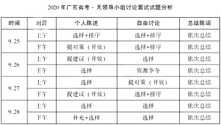 2020廣東省考面試共計(jì)4天時(shí)間,9.28-28號(hào)。每天上下午各一套題,共計(jì)八套題。具體情況見下表: