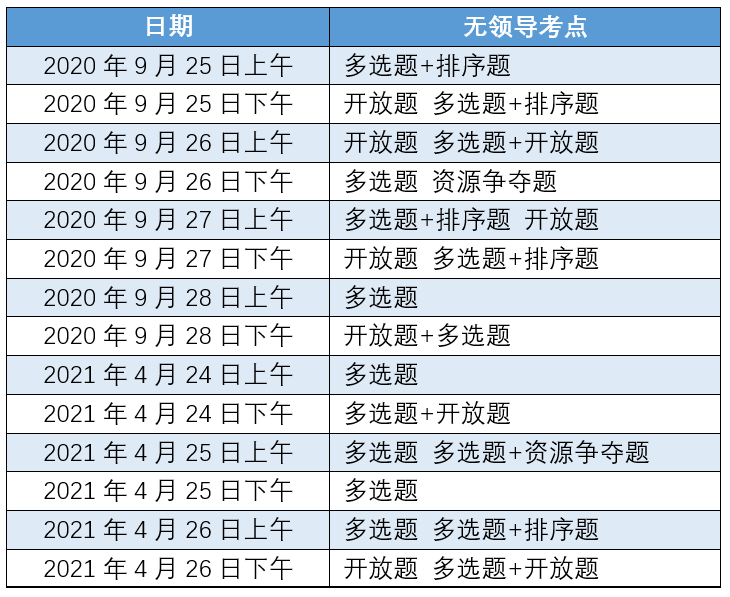 根據(jù)2020年和2021年考察的題目來看,考察比較多的題型是多選題、開放題。資源爭奪題考察的頻率不高,單獨考察只出現(xiàn)過一次。排序題常常作為復合題型的考察點出現(xiàn)在題目中。
