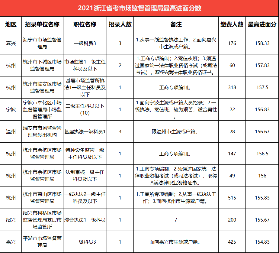 下表是2021浙江省考中市場監(jiān)督管理局最高進面分前十職位,進入前十的5家招錄單位,均來自浙江省會城市--杭州。