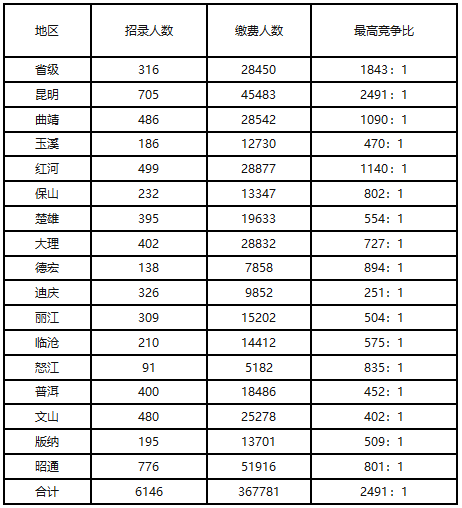 2021年云南省公務(wù)員考試共招錄6146人,設(shè)置4469個(gè)職位,報(bào)考人數(shù)為367781人,從這些數(shù)據(jù)我們可以知道省考競(jìng)爭(zhēng)十分激烈。在2021年省考招錄中,招錄人數(shù)最少的地市是怒江,共招錄91人,報(bào)名人數(shù)5182人,平均競(jìng)爭(zhēng)比達(dá)到57:1。招錄人數(shù)最多的地市是昭通,共招錄776人,報(bào)名人數(shù)51916人,平均競(jìng)爭(zhēng)比達(dá)到67:1。在全省的最高競(jìng)爭(zhēng)比中,昆明市的最高競(jìng)爭(zhēng)比高達(dá)2491:1,在全省各地市中名列第一。可見(jiàn),不管在哪個(gè)地市,省考崗位都是炙手可熱的,千萬(wàn)不能掉以輕心。