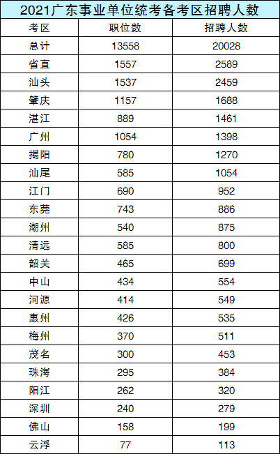 2021年全省職位數(shù)13558個(gè),共招20028人。其中,綜合崗招5702人,醫(yī)療崗10354人,教師崗招3972人,相比2020年,醫(yī)療崗招人大幅增加!2021年省直招考人數(shù)最多,共招2589人,其實(shí)是汕頭,有1537個(gè)職位數(shù),招2459人,具體全省情況如下: