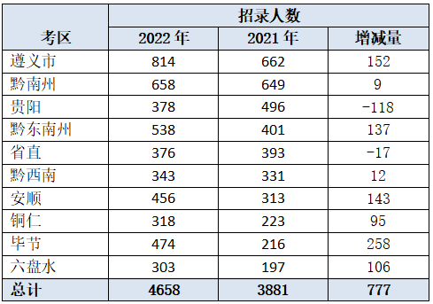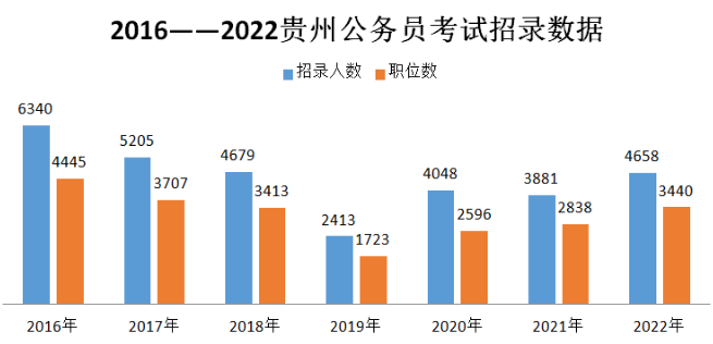 2022貴州省考招錄總?cè)藬?shù)為4658人,3440個(gè)職位,與去年相比增加了777人、602個(gè)職位。從2016之后,貴州省考招錄人數(shù)穩(wěn)定在四千—五千,去年小幅度回調(diào),今年再次“崛起”。廣大考生們不要為招錄數(shù)據(jù)的變動(dòng)而喪失信心,做好備考提升實(shí)力,可以實(shí)現(xiàn)成“公”夢(mèng)想。