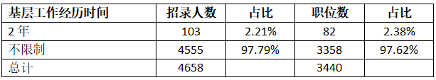 本次考試招錄對(duì)工作經(jīng)歷要求依舊非常寬松,有4555人、3358個(gè)職位不需要兩年基層工作經(jīng)歷,占總?cè)藬?shù)的97.79%、總職位數(shù)的97.62%,占比比去年提升2個(gè)百分點(diǎn),這些職位應(yīng)屆生都可以報(bào)名。這對(duì)于尚未就業(yè)的應(yīng)屆生而言是利好消息,找工作的同時(shí)也可以選擇考公務(wù)員增加自己的就業(yè)成功率。