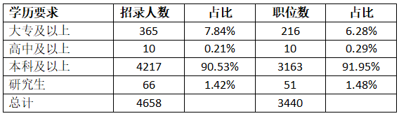 3163個(gè)職位要求最低學(xué)歷為本科,占總職位數(shù)的91.95%,數(shù)量與占比均比去年略有上升,還有66人、51個(gè)職位要求研究生學(xué)歷,由以上數(shù)據(jù)可看出,學(xué)歷門檻略有提升。