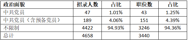 2022貴州省考中要求為中共黨員的職位集中在黨的機(jī)關(guān)和行政機(jī)關(guān),僅有47人要求必須是中共黨員,還有189人預(yù)備黨員可以報(bào)名,絕大部分無政治面貌要求,4422人、3246個(gè)職位不要求中共黨員的身份,廣大群眾都可以報(bào)名。