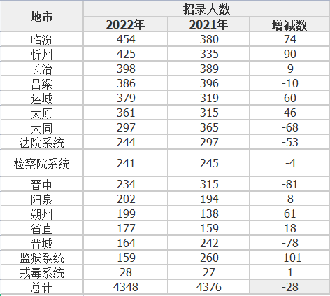 從2022山西省考招錄來看,臨汾市招錄人數(shù)最多,達(dá)到454人,超越去年的呂梁市穩(wěn)居榜首,招錄人數(shù)最少的依舊是戒毒系統(tǒng),僅招錄28人;從增減量來看,忻州、運城、朔州等地市逆勢上漲,監(jiān)獄系統(tǒng)降幅最大,比去年減少了一百多人,有地域選擇的考生可以參考上述數(shù)據(jù)。