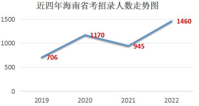 從2019到2022的海南省考招錄人數(shù)走勢圖來看,2022年海南招錄人數(shù)為四年來最高,較去年多515人,漲幅約55%