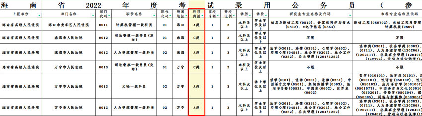 還有一點需要注意,《職位表》中所要求的學歷不是指報考人員所獲得的最高學歷,而是與職位表所需專業(yè)相匹配的學歷。海南職位表對專業(yè)要求劃分清晰,分別有“研究生專業(yè)名稱及代碼”、“本科專業(yè)名稱及代碼”、“專科專業(yè)名稱及代碼”三列,考生要結合《海南省2022年度考試錄用公務員(參照公務員法管理工作人員)專業(yè)參考目錄》進行職位選擇。