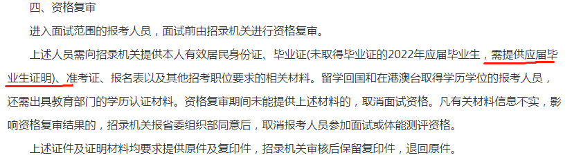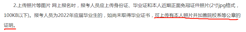 2022年普通高等學歷教育應屆畢業(yè)生須在2022年8月31日前取得畢業(yè)證書、學位證書,目前還沒有取得畢業(yè)證、學位證的考生,要在報名時上傳應屆畢業(yè)生證明,進面后在資格復審環(huán)節(jié)也需要出示原件。應屆生要盡快聯(lián)系輔導員、班主任準備好證明。
