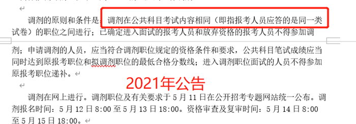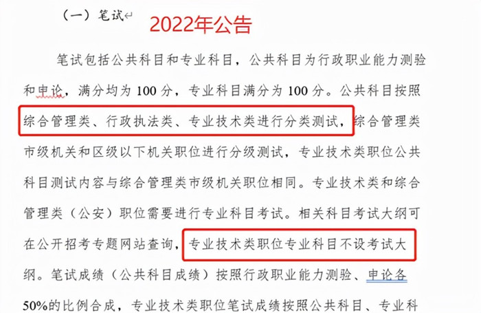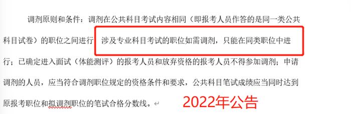 歷年招考公告中,沒有明確說明含專業(yè)科目考試的職位如何進(jìn)行,在2022年,涉及專業(yè)科目考試的職位如需調(diào)劑,只能在同類職位中進(jìn)行在公告中凸顯,你報(bào)考的崗位有專業(yè)測試,那你只能在同類崗位中調(diào)劑,也就是說你的專業(yè)成績將伴隨著你一路,所以,更要求考生盡可能的提高自己的各項(xiàng)能力,才能在后續(xù)的每個(gè)階段中贏得考試。