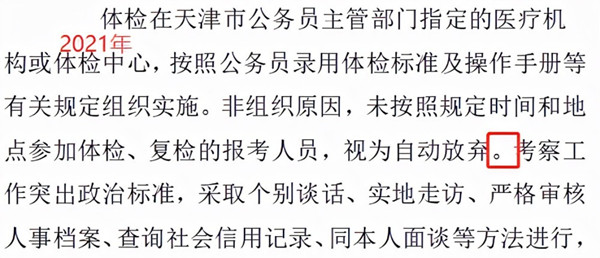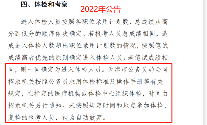對比2021年公告,可以看出2022年天津體檢要求在指定的醫(yī)療機(jī)構(gòu)或體檢中心組織體檢,所以各位考生要注意一下招錄機(jī)關(guān)的通知,按照要求進(jìn)行體檢,不要自行體檢。