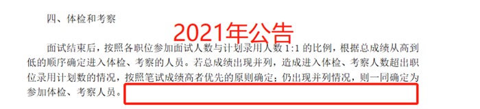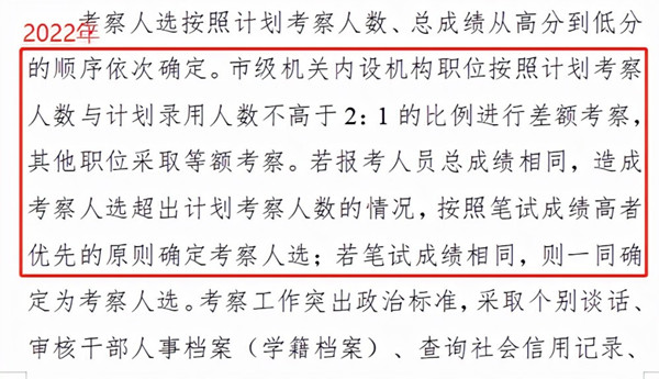 2022年公告中,在考察環(huán)節(jié)明確指出“市級(jí)機(jī)關(guān)內(nèi)設(shè)機(jī)構(gòu)職位按照計(jì)劃考察人數(shù)與計(jì)劃錄用人數(shù)不高于2:1的比例進(jìn)行差額考察,其他職位采取等額考察”。報(bào)考市級(jí)機(jī)關(guān)內(nèi)設(shè)機(jī)構(gòu)職位的同學(xué)一定要注意,進(jìn)入面試后還需要面臨考察。其次還明確指出“若總成績相同,造成考察人選超出計(jì)劃考察人數(shù)的情況,按照筆試成績高者優(yōu)先的原則確定考察人選”,可見筆試成績是尤為重要的,一定要重視筆試,在筆試成績上占優(yōu)勢,后期才不會(huì)出現(xiàn)掉崗的情況。