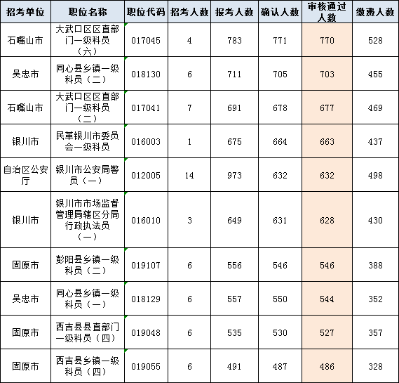 以下為審核通過人數(shù)最多的前十崗位