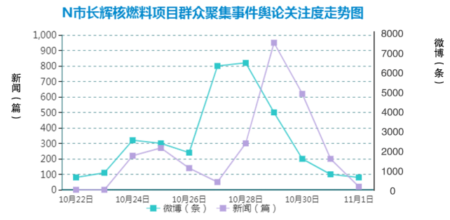 從10月22日至24日短短三天內(nèi),以N市市民為代表的相關(guān)地區(qū)居民進(jìn)行了一系列的線上抗?fàn)幓顒?,尋求與政府的溝通機(jī)會。線上抗?fàn)幰跃W(wǎng)絡(luò)討論為代表,出現(xiàn)了“N市核危機(jī)”, N市燃料工廠、 “N市反核行動”等多個“熱點話題”,形成強(qiáng)大的輿論合力。市民的抗?fàn)幮袨閺木€上到了線下,連續(xù)三天組織較大規(guī)模的群體上訪。
