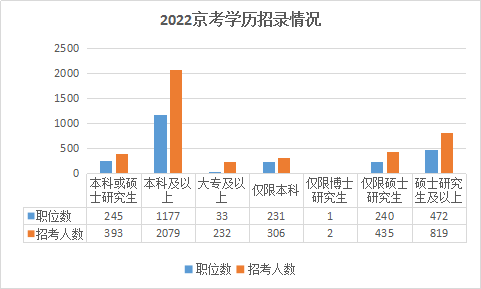 2022北京公務(wù)員考試提供的職位中,學(xué)歷要求劃分明細(xì),大專可報(bào)職位共有33個(gè),占總職位數(shù)的1.38%,招錄232人,占總招錄人數(shù)的5.44%;本科可報(bào)職位共有1686個(gè),占總職位數(shù)的70.28%;碩士研究生可報(bào)職位共有2167個(gè),占總職位數(shù)的90.33%;博士研究生可報(bào)職位共有1683個(gè),占總職位數(shù)的70.15%;