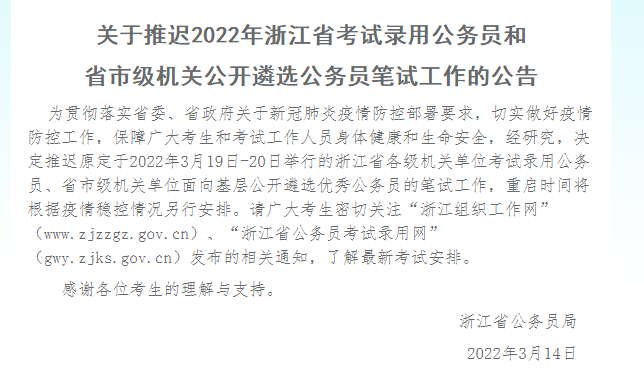 官方通知來啦!??!因疫情影響,原定3月19-20日舉行的2022年浙江公務員筆試再次延期,具體考試日期另行公布!↓↓↓