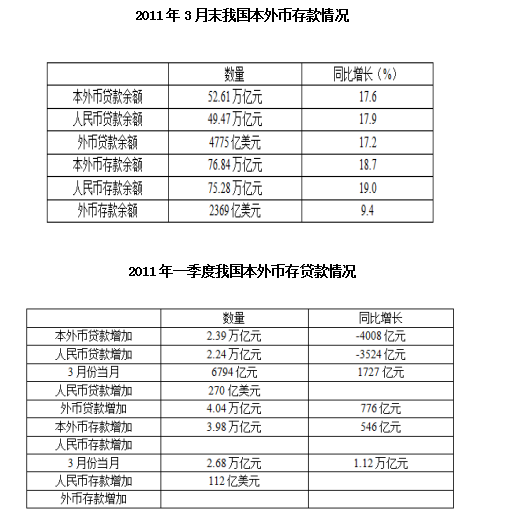 C、2011年3月本外幣存款余額同比下降4008億元