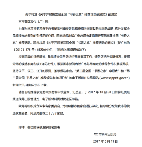 D.XX市新聞出版局轉(zhuǎn)發(fā)《關(guān)于開展第三屆全國“書香之家”推薦活動的通知》