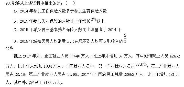 89.2014年,參加城鎮(zhèn)居民基本醫(yī)療保險(xiǎn)的人數(shù)約占當(dāng)年參加城鎮(zhèn)基本醫(yī)療保險(xiǎn)人數(shù)的:( )