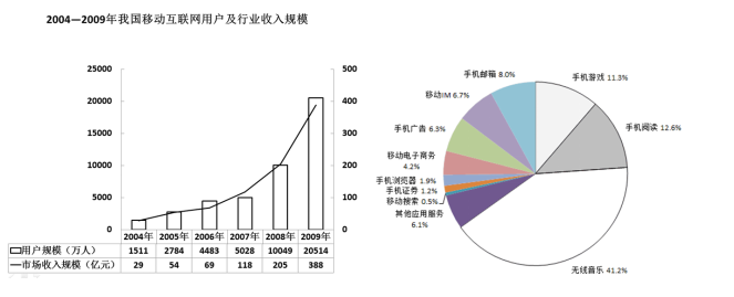 D、各項移動互聯網市場服務中,2010上半年收入相差最少的是手機廣告和移動IM