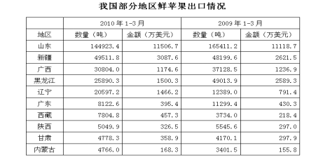 2010年1-3月,我國鮮蘋果出口總量為31.2萬噸,與上年同期相比下降11%;總出口額為2.1億美元,與上年同期相比增加4%;平均單價為679美元/噸,與上年同期相比上升17%。2010年1-3月,我國鮮蘋果對俄羅斯的出口量為5.71萬噸,同比減少13%,總出口額為3693萬美元,同比減少3%;對歐盟27國的出口量為3145噸,同比減少55%,總出口額為311萬美元,同比減少45%。
