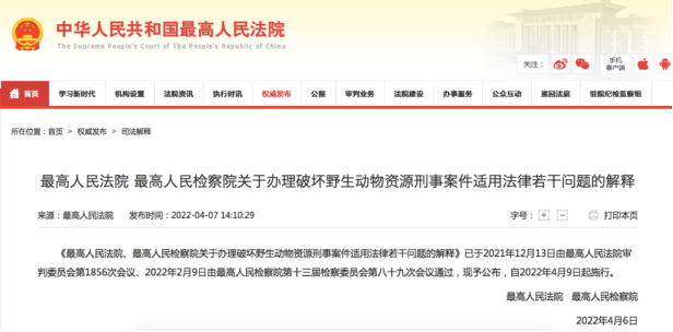最高人民法院、最高人民檢察院聯(lián)合發(fā)布《關(guān)于辦理破壞野生動物資源刑事案件適用法律若干問題的解釋》,自2022年4月9日起施行。