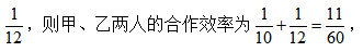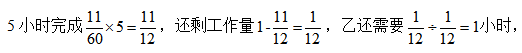 有一項(xiàng)工作,甲單干需要10個(gè)小時(shí)完成,乙單干需要12個(gè)小時(shí)完成。甲、乙兩人同時(shí)工作5小時(shí)后,甲另有其他的事情去做,只有乙繼續(xù)工作,那么完成這項(xiàng)工作共用了( )小時(shí)。