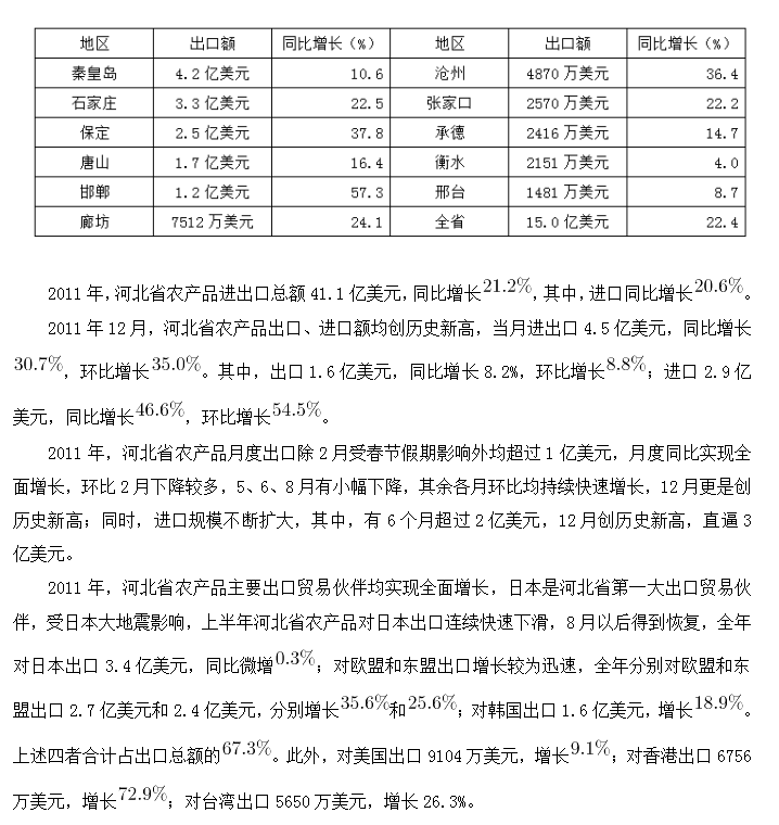 2011年河北省農(nóng)產(chǎn)品出口情況