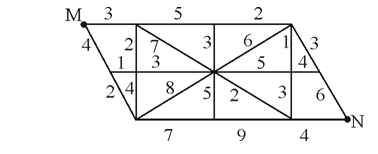 76. M、N兩地之間要架設電纜,已知兩地之間地勢復雜,電纜的架設需要繞道,繞道線路和相應的線路會導致的電量損耗(即所示數(shù)字,單位略)見右圖。則從M到N架設電纜的電量損耗最低為: